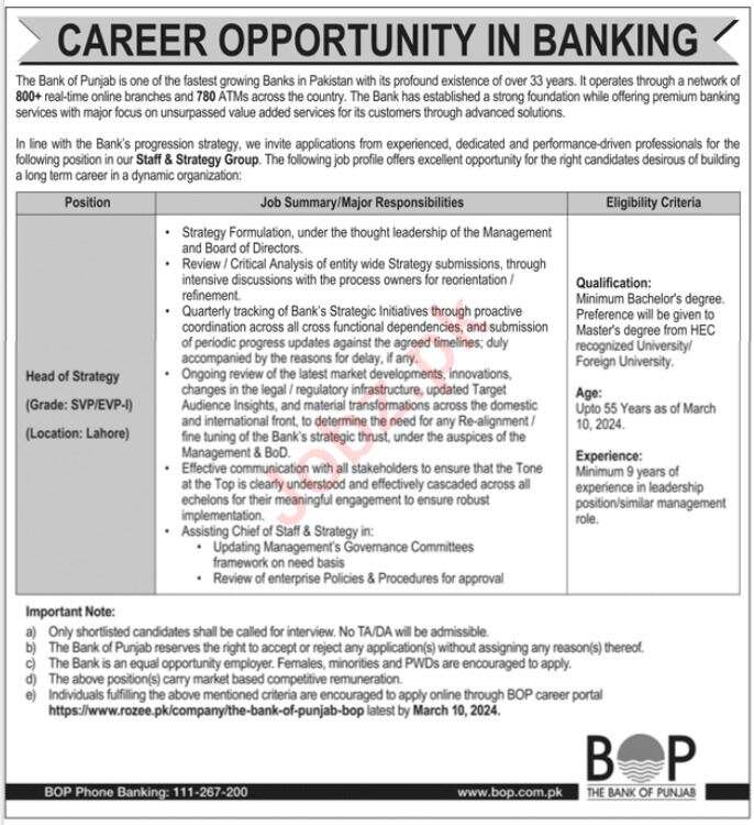 Vacant posts including head of strategy are announced in The Bank of Punjab BOP Lahore, lahore Punjab Pakistan as per 25 February 2024 advertisement in daily Jang Newspaper. Preferred Education is Bachelor etc.