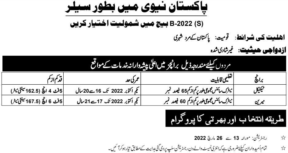 Join Pak Navy as Sailor Jobs 2022 has been introduced via the commercial for B-2022(S) Batch and functions from appropriate individuals are invited on the prescribed software kind via online registration at www.joinpaknavy.gov.pk. In these Latest Pak Navy Sailor Jobs 2022, the eligible Male candidates from throughout the nation can apply via the process outlined by the group and might get these Jobs after the whole recruitment course.