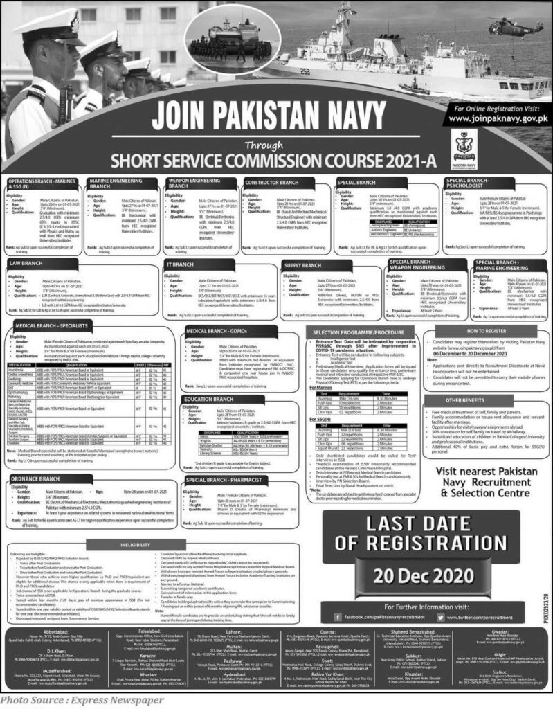 Join Pak Navy Through Short Service Commission Course in December 2020. Short Service Commission Course advertisement was Published in Daily Express Newspaper on 06th December 2020.
