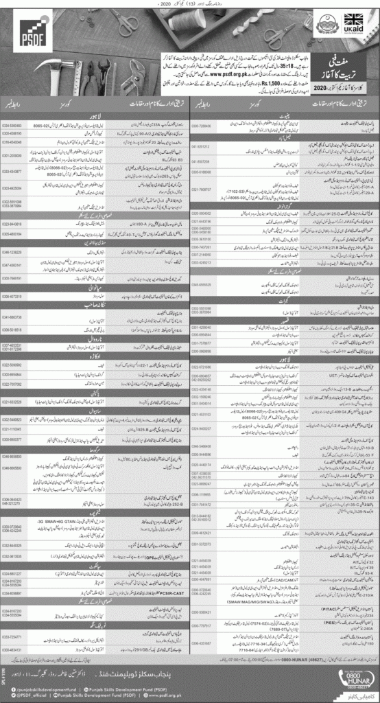 Tap this page for the advertisement “PSDF Free Training Courses 2020, Punjab Skills Development Fund”. Applications are invited for the courses like CNC Machine Operator, Computer Applications, Electrician, Motor Winding, NVC Level 2 in Mechanical Technology, Quantity Surveyor, Poultry Farming, Quality Control in Garments, Fashion Design, Industrial Stitching Machine Operator, Electrical Wiring, Machinist, Fabric Cutting Expert, AutoCAD, Web Design & Development, Safety Inspector, Mobile Application Development, Computer Applications, Computerized Accounting, Diploma in Food & Cooking, Receptionist, Mill Wright, Beautician, Restaurant Manager, Fabric Printing, Domestic Tailoring, Building Painter, Fitter General, Welder, Computer Hardware & Network Professional, and Civil Surveyor. Applications are invited from Punjab Domiciled candidates only. The age limit for the applicants is 18 to 35 years.